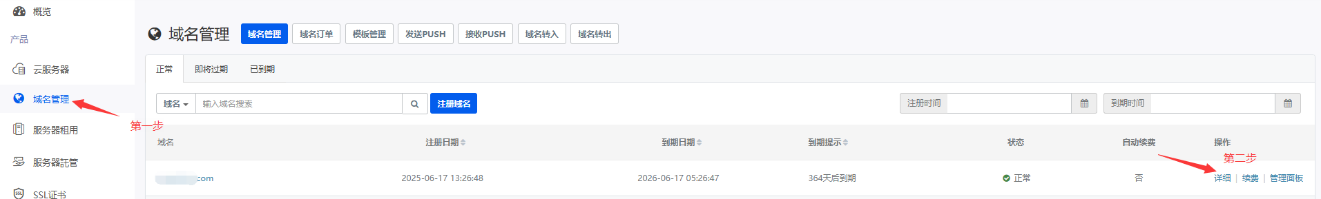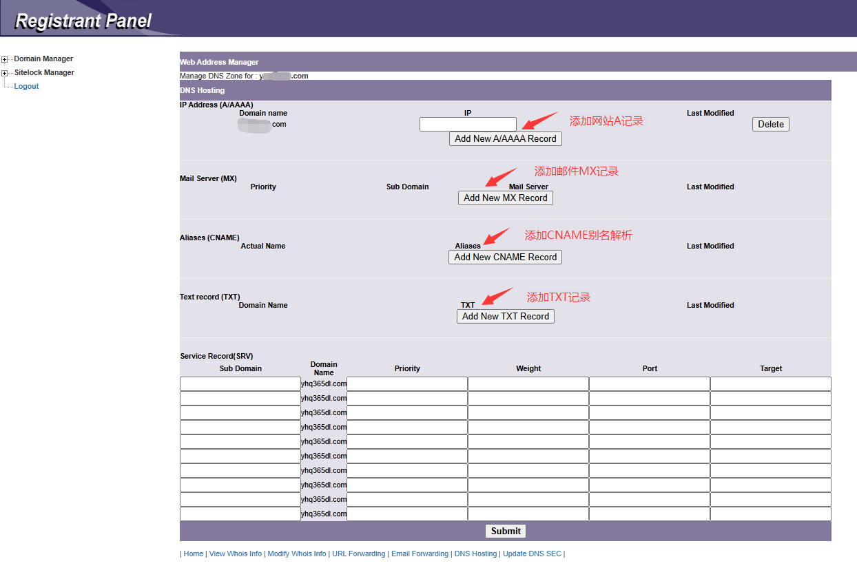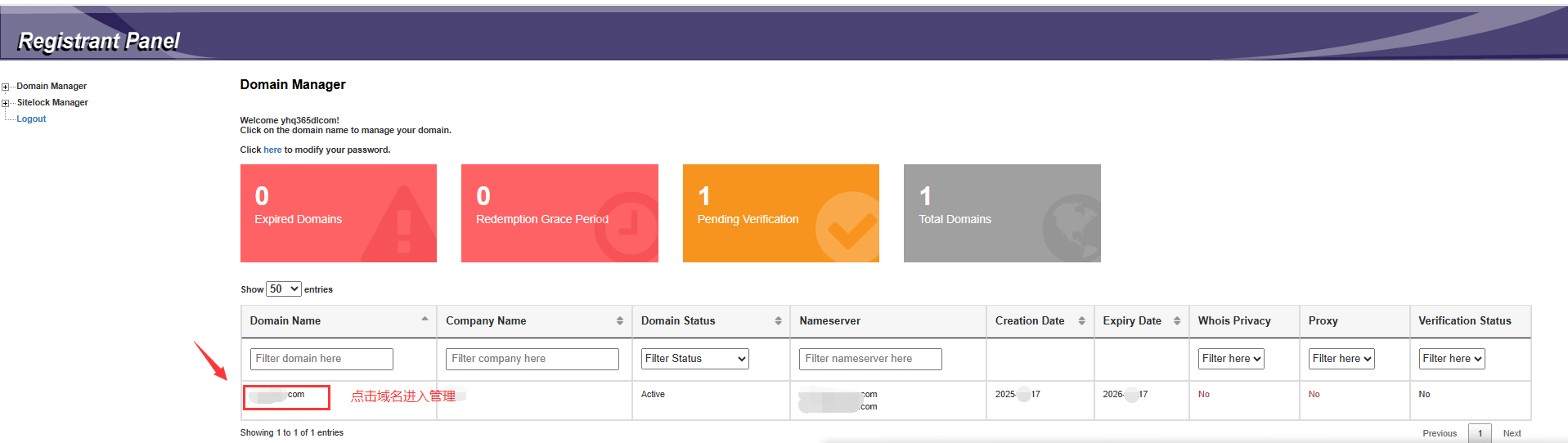 3.进入域名管理页面,点击Modify DNS可以修改域名DNS 比如使用cloudflare的CDN服务器 可以再这里修改域名DNS,DNShosting可以添加A记录 MX记录